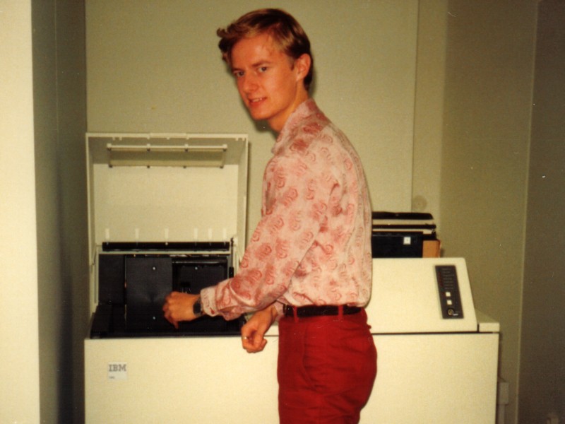 Here I am at my summer job in 1984, filling a magazine of 8-inch floppies into an IBM System/36 minicomputer. It was used by the company my father worked for, so I got a summer job to manage it.