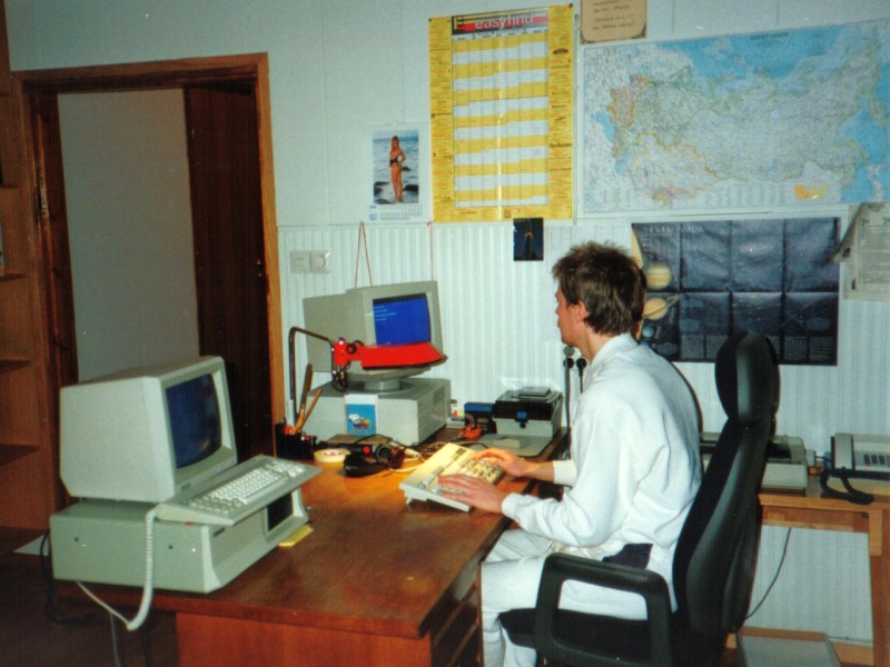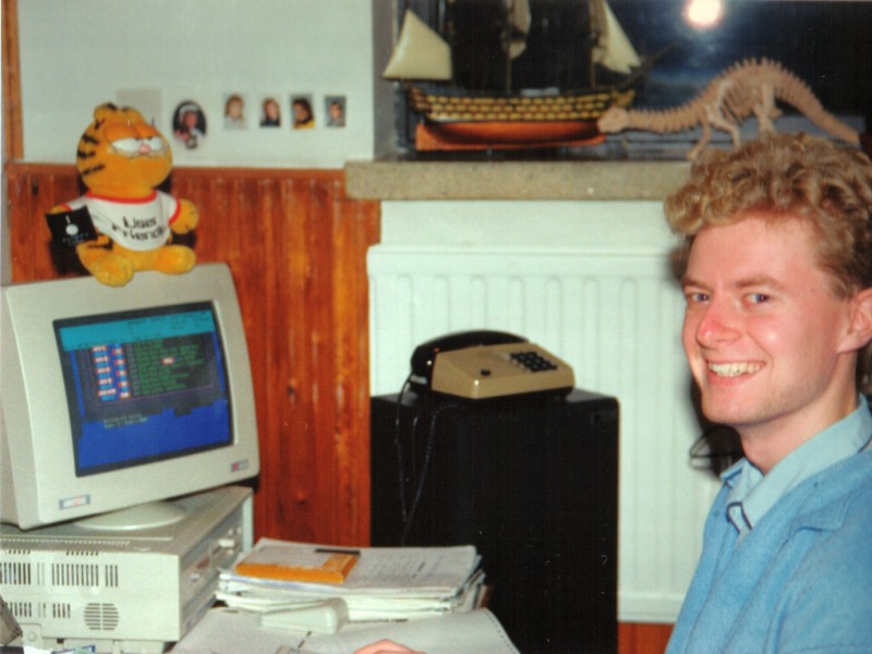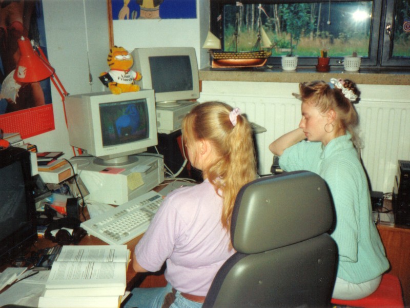 My cousin and sister playing Leisure Suit Larry on my new Hyundai-386C PC clone. The old Amstrad is still in the background. Looks like I have the Ferraro's "Programmer's Guide to the EGA and VGA Cards" book open on my desk, as I was already working on stuff for LineWars II at that time. I was still living with my parents, and my room had already become rather cramped with all the consumer electronics I had managed to collect by that time.