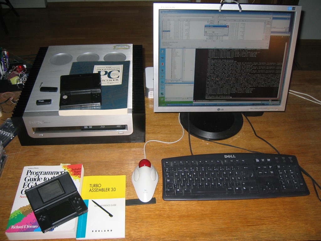 Here is my desktop computer setup, which I used in 2011 to build DSx86, for example. You can see I run Ubuntu Linux in a window within Windows XP, and I am currently transferring the latest build of DS2x86 onto my Nintendo DS Lite via FTP.