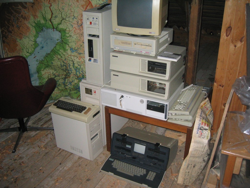 Here is a picture from the "Computer Graveyard" section of my attic. :-) On the left, on top of a much more recent Pentium 60MHz PC clone, is my very first computer, the Commodore VIC-20. I got it as a birthday present in September of 1982. On the floor under the table is my father's old "luggable" computer, the Osborne 1, from around the same time. On the table is first a Nokia MikroMikko 3, back from when Nokia still built personal computers. I think I got this from my workplace when they upgraded to more modern computers. On top of that are two Bondwell PC/XT clone cases, with most of their diskette drives stripped out. The topmost computer is my old Amstrad PC1640, with the ECD EGA display. On the left are a couple of huge tower cases, which I used for the early 486 computers.