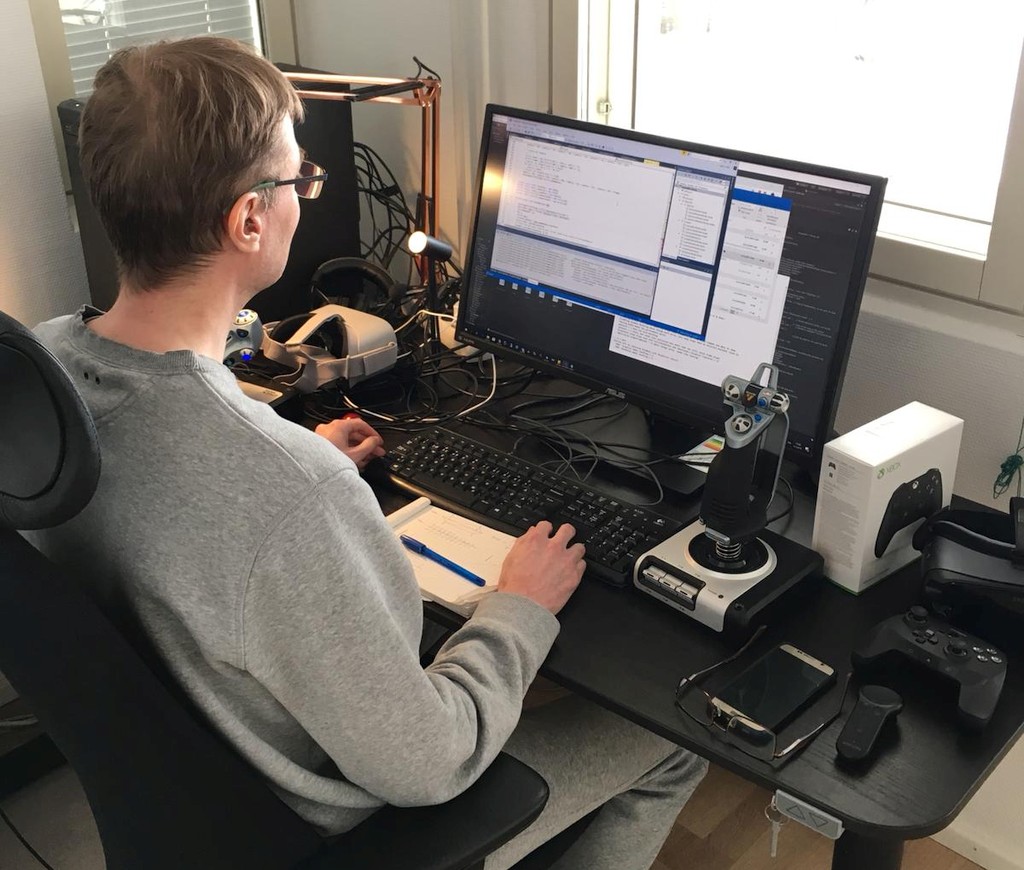 Here is a picture of me sitting at my current workstation in my new apartment (where I moved in December 2015). I am working on LineWars VR, and you can see the Oculus Go device in the background, and the Gear VR device in the far right of the picture. I am using an ASUS 4K monitor and a GTX 980 graphics card to develop VR software. The joystick is part of a Saitek X52 Flight Control System, which also includes a throttle. My PC has an Intel i7-6700T 2.8GHz low-power CPU, so it can be passively cooled and is thus very quiet.