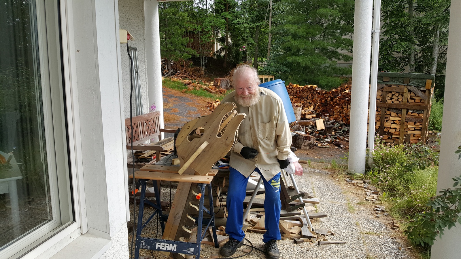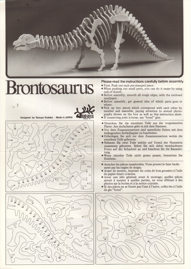 The new pier was finished by the end of May. At this point we realized we have a lot of wood left over, and dad got the idea of using that wood for building a big dinosaur. I had built a 2 meter long dinosaur from 12mm plywood back in 2016. This was based on an instruction sheet I had saved from a wooden puzzle toy from the 1980's designed by Tatsuya Kodaka. Here is a scan of the instruction sheet, and a picture of my plywood dinosaur under construction back in 2016.