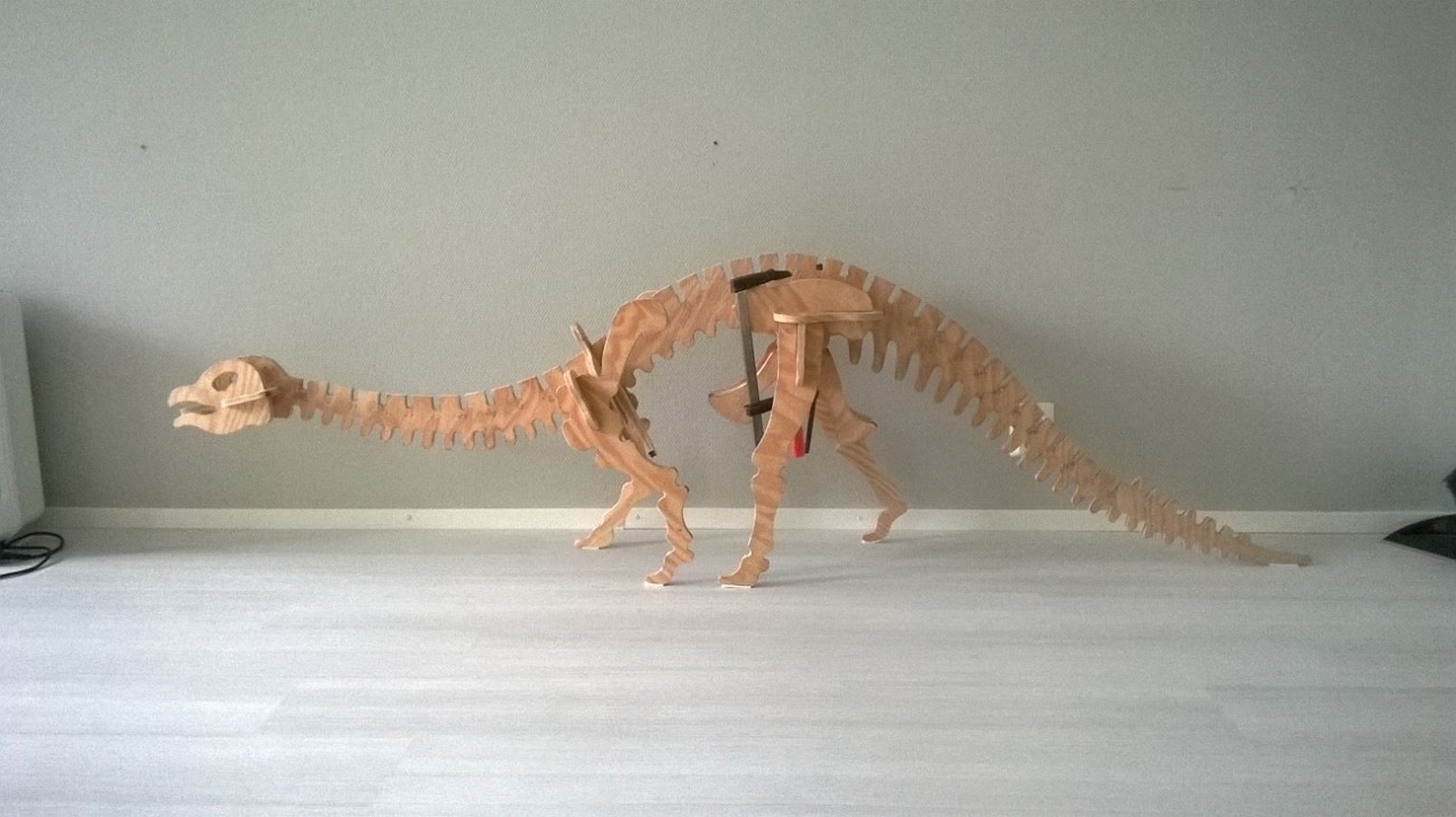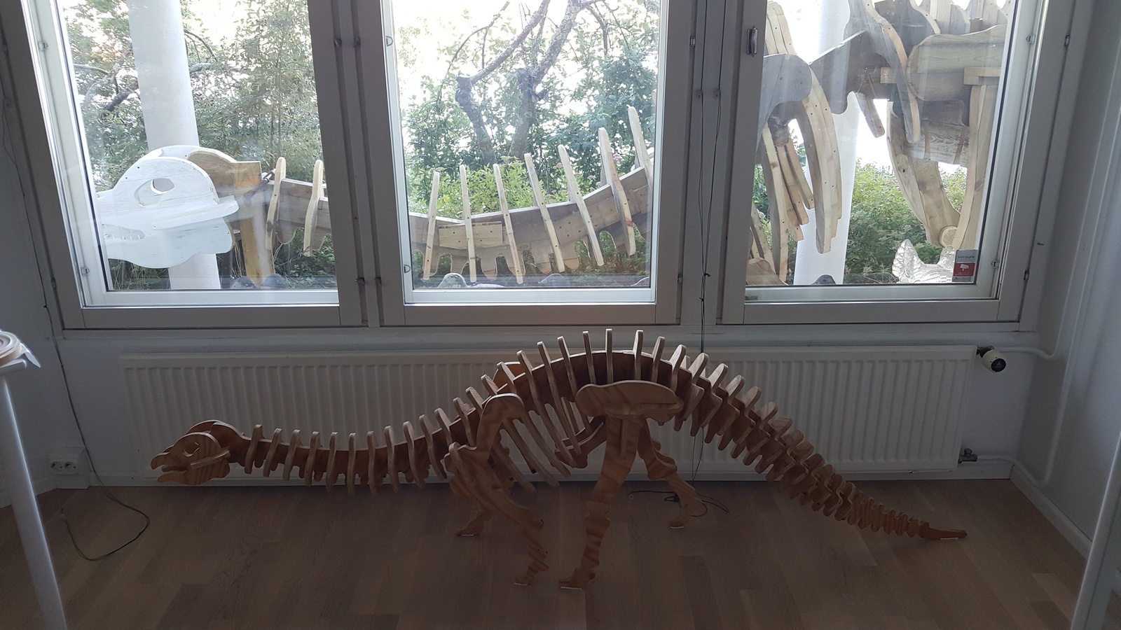 I had forgotten to take pictures of the construction steps during June. We started the work by me projecting the drawing on my wall using a video projector, and then tracing the images on cardboard. The size of the dinosaur was limited by the area of my wall, the maximum zoom factor of my projector, the amount of wood we had, and the maximum size of the cardboard pieces we had to trace the images on.
