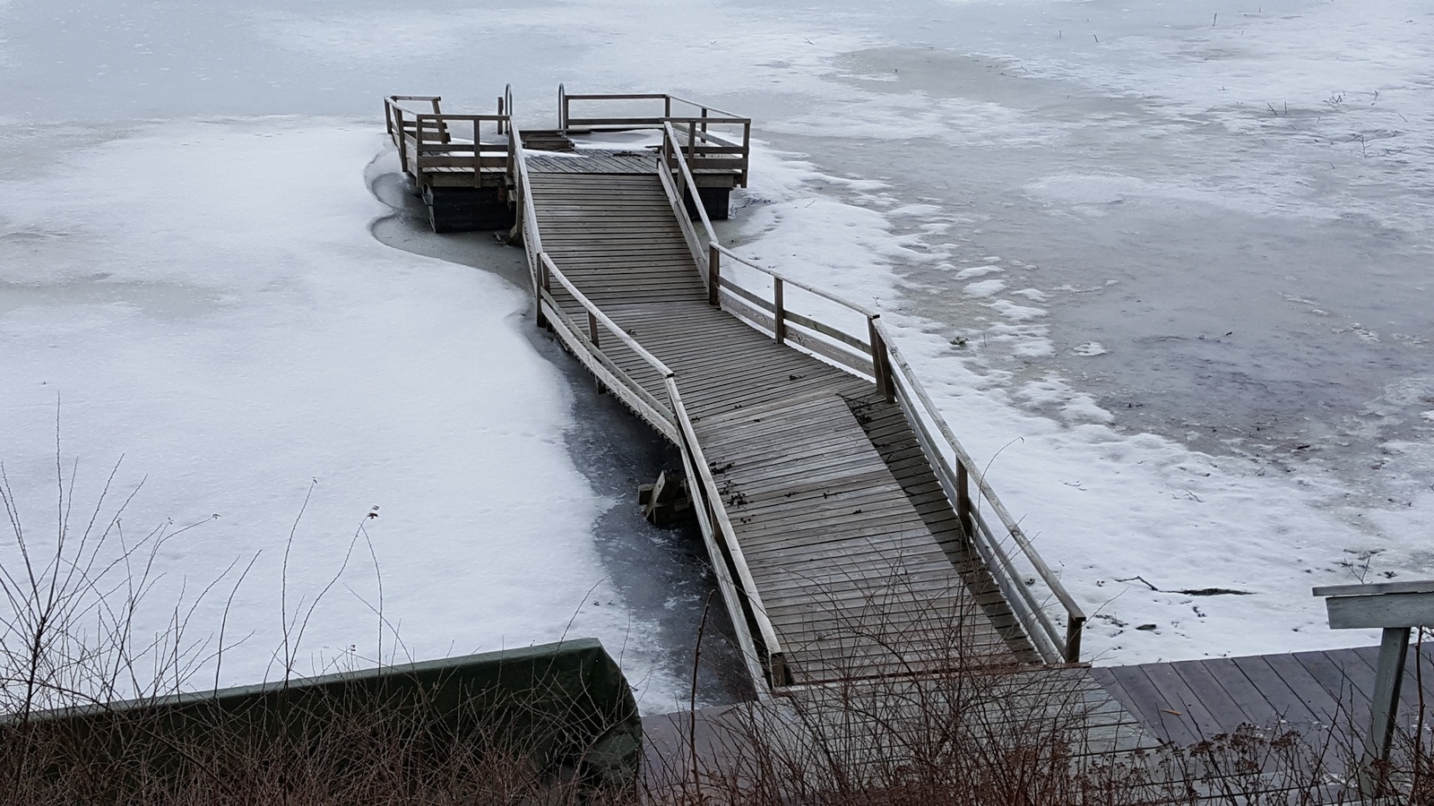 This is what our pier looked like, after the ice had pushed the floating platform towards the shore. Some of the floats had begun to leak the previous summer, so the pier would have needed some maintenance anyways.
