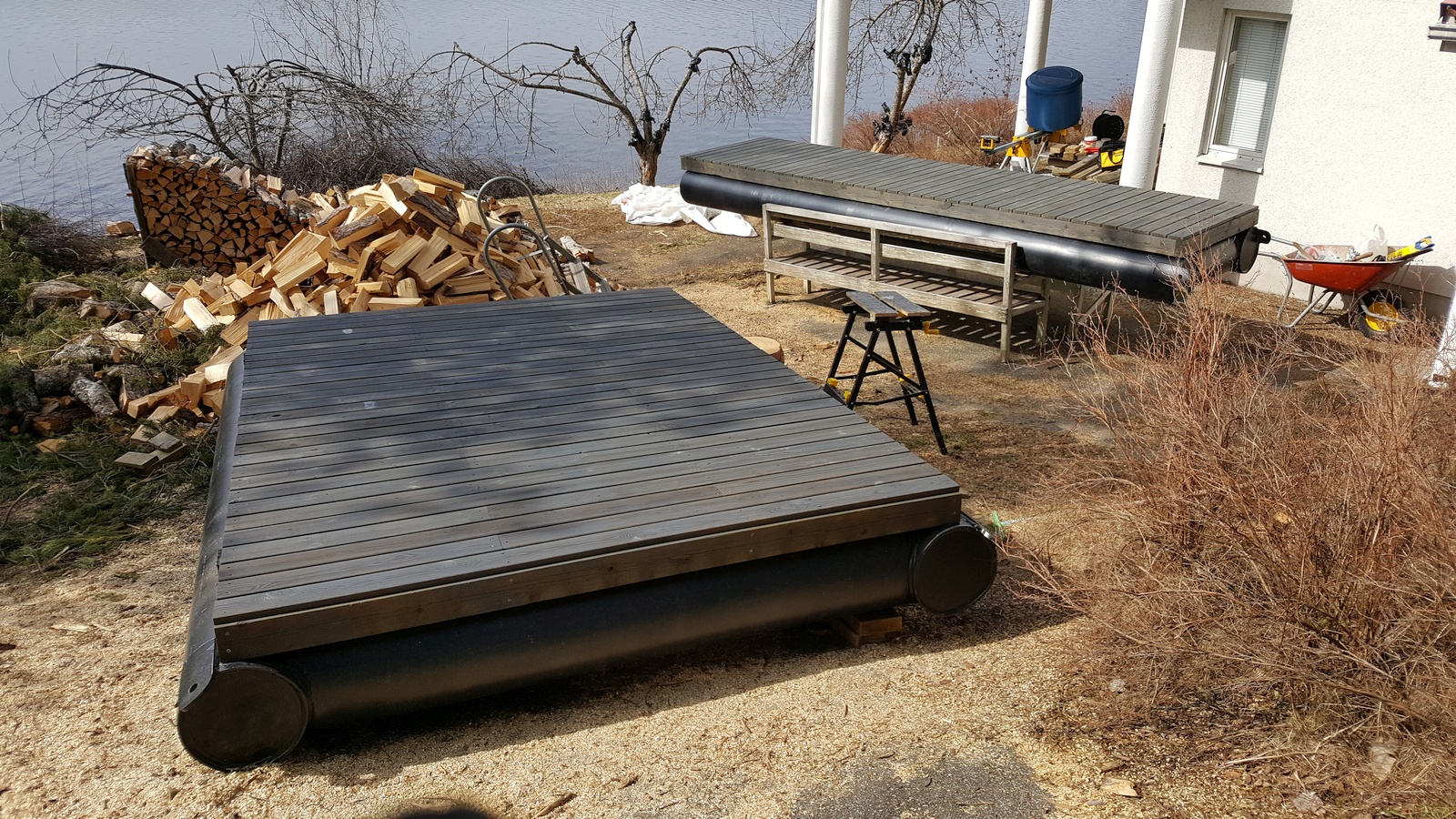 Dad began disassembling the old pier during April, and then purchased new floating platforms. He then began building a new pier using wood from the old disassembled pier. Here are the parts of the new pier.