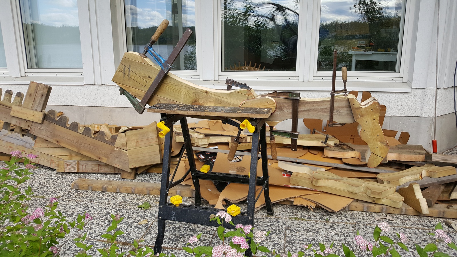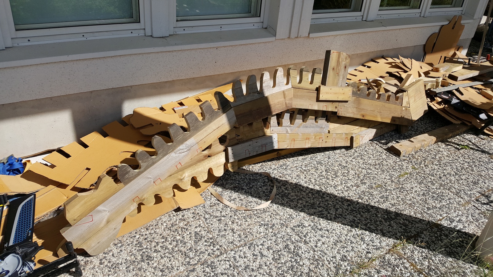 By July our construction work was well underway. Here is a snapshot of the construction process at the start of July. The main spine parts have been mostly constructed. As you can see, they are built from scrap wood beams, and thus are not very uniform.