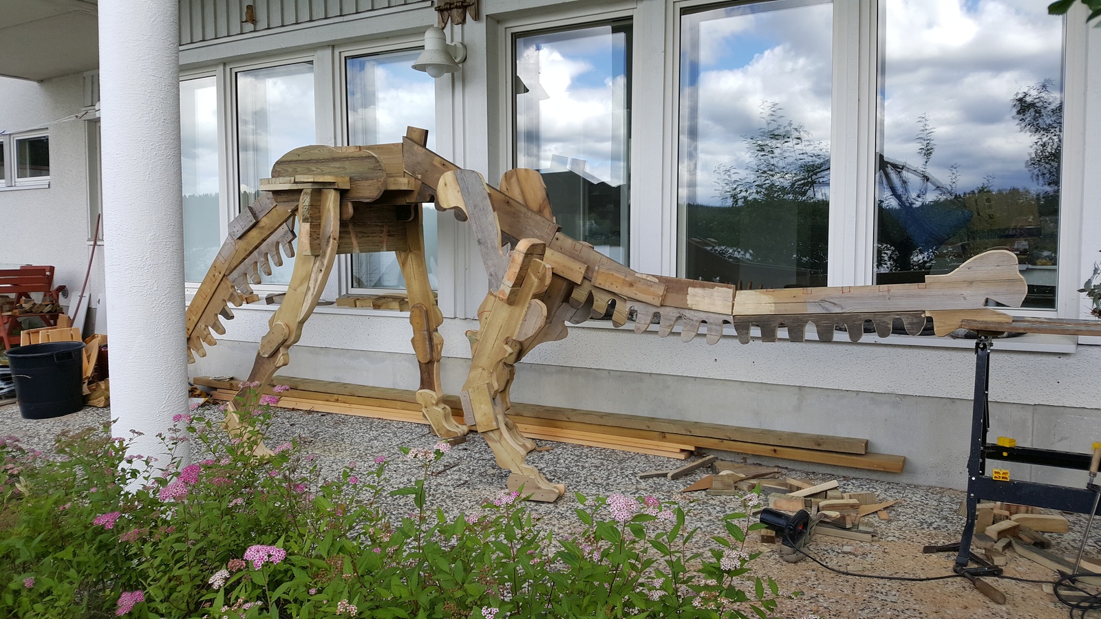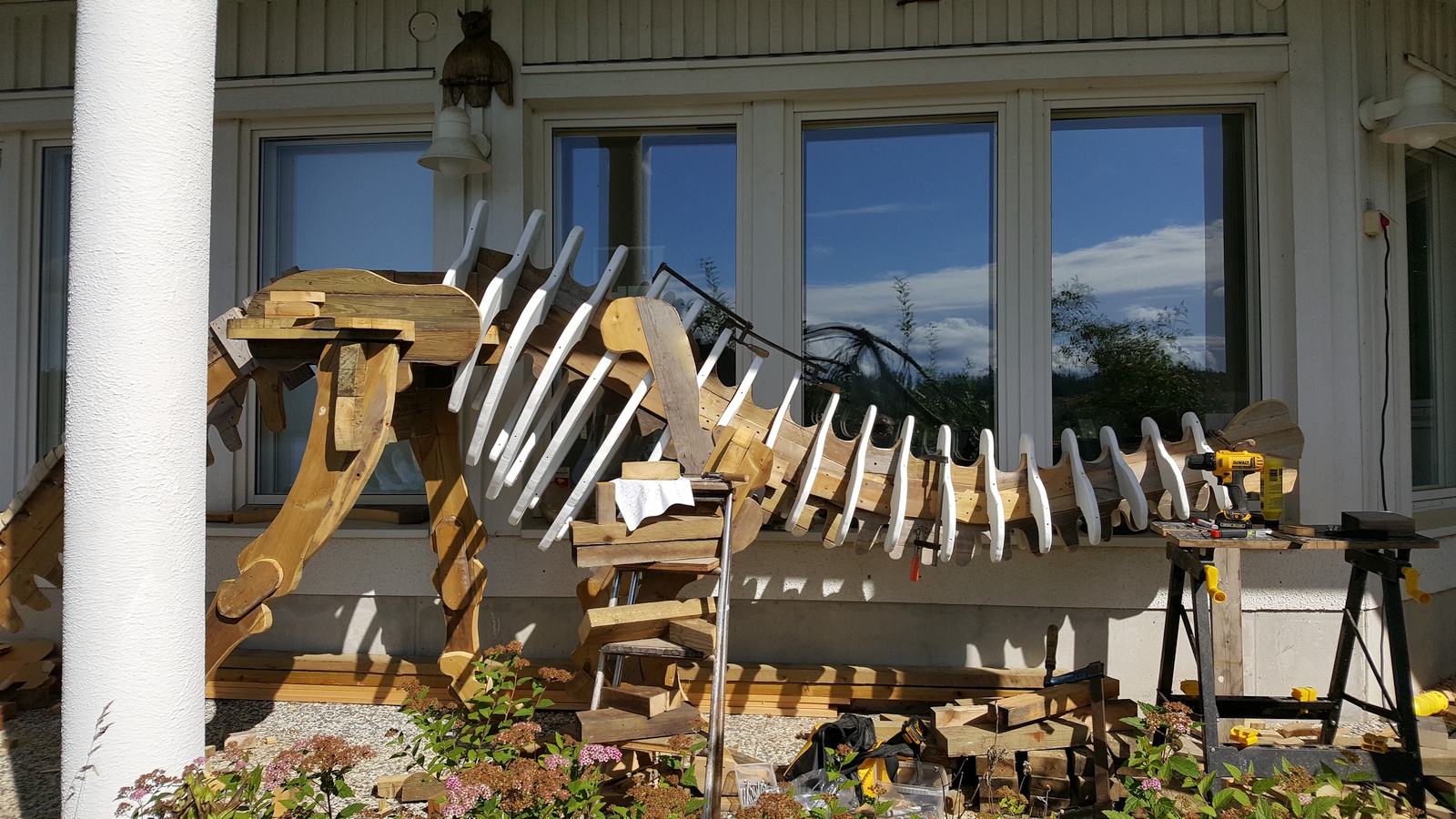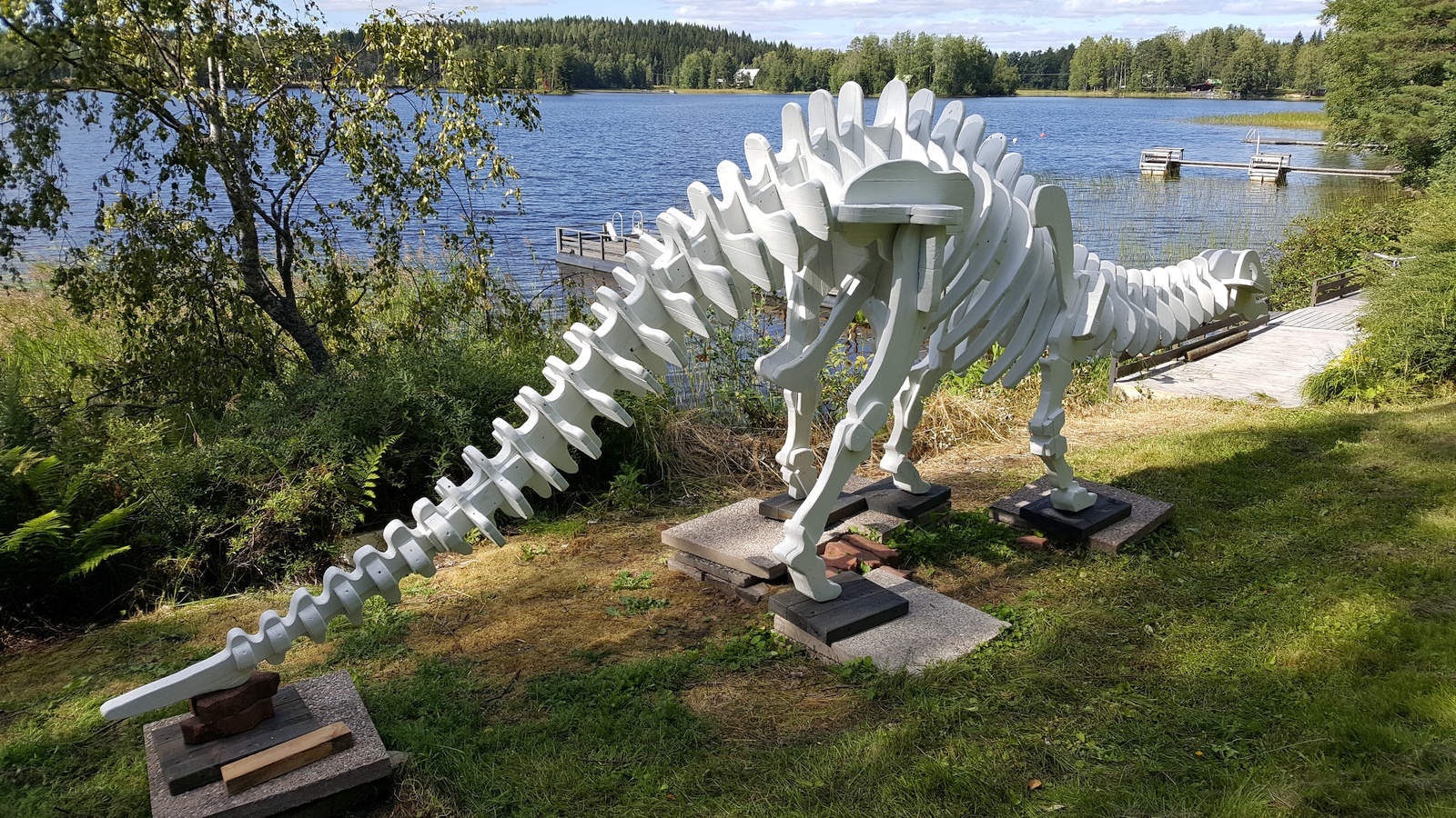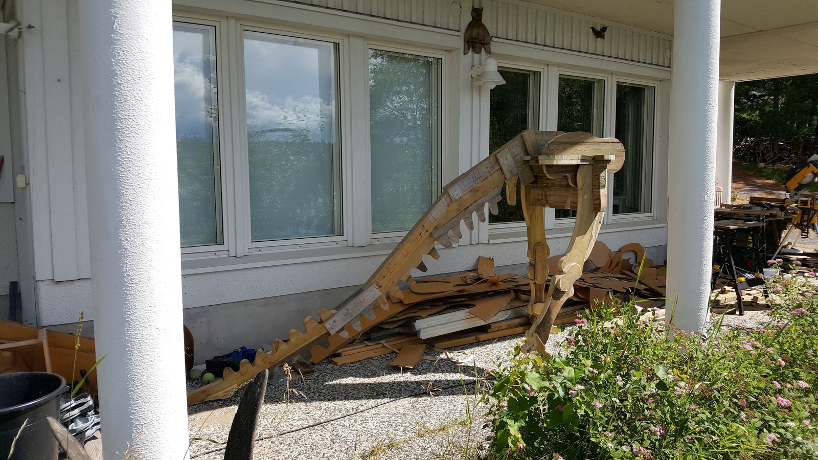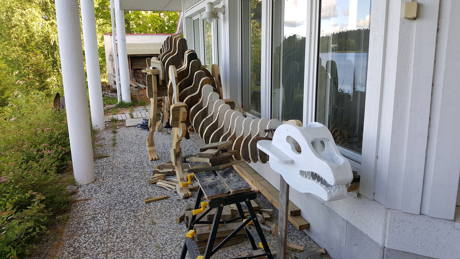 This is a build log of a 6 meters (20 foot) long lawn dinosaur my dad and I built during the summer of 2020. When the ice on the lake melted, it wrecked our pier, and so dad built a new pier in May. There was quite a lot of treated wood left over, and we wondered what to do with that. For a long time dad had wanted to build a large dinosaur on our yard, but we had not been able to decide on suitable material to use. Now we had some extra treated wood, so we decided to use that for the dinosaur!
