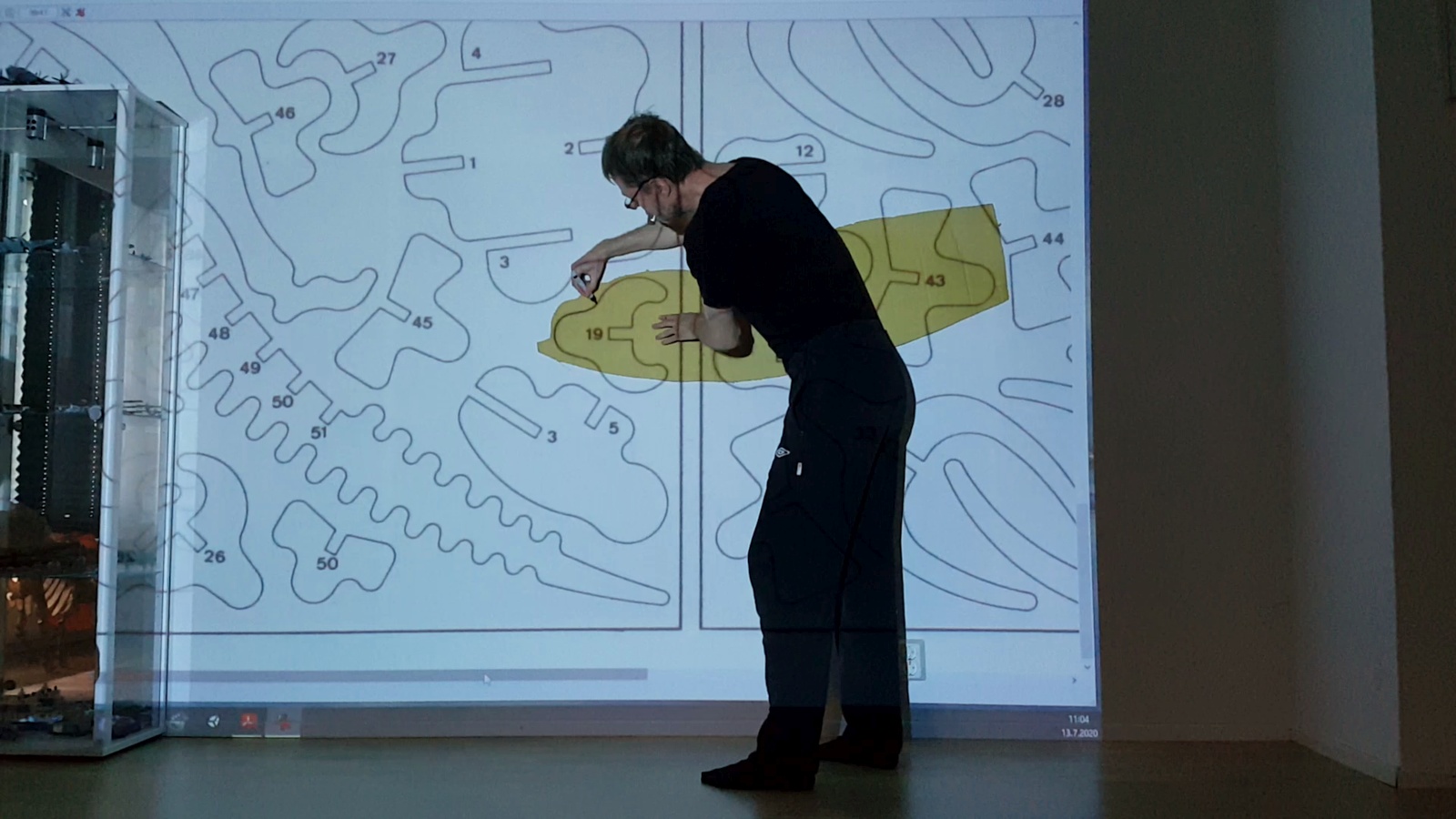 There were still some parts remaining that I had not traced on cardboard yet. We were beginning to run out of larger cardboard pieces, but luckily the rest of the parts were symmetrical, so it was enough to trace just one side on the cardboard. We could then flip the piece to draw the full part on the wood. Here I am tracing part number 19.