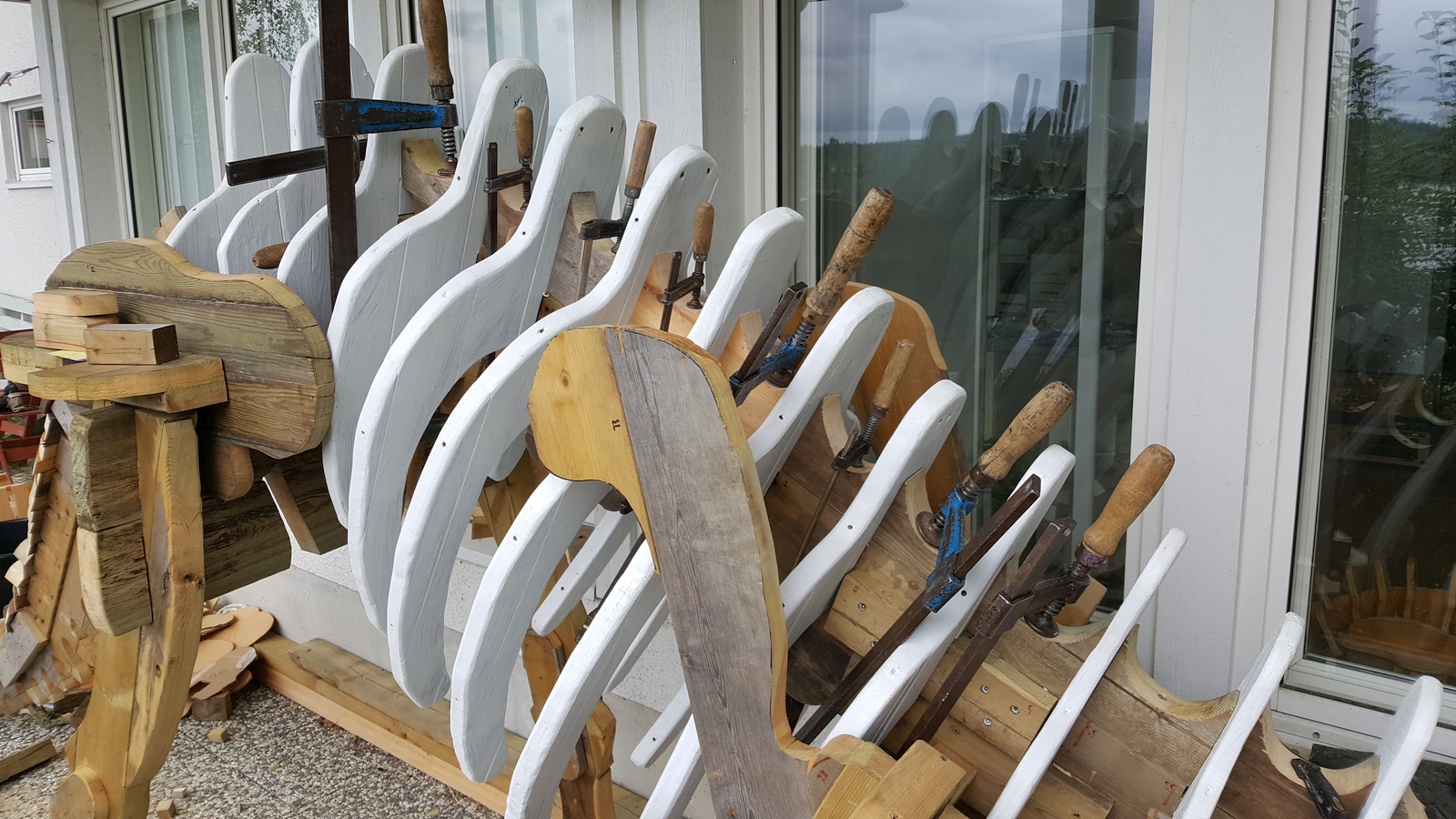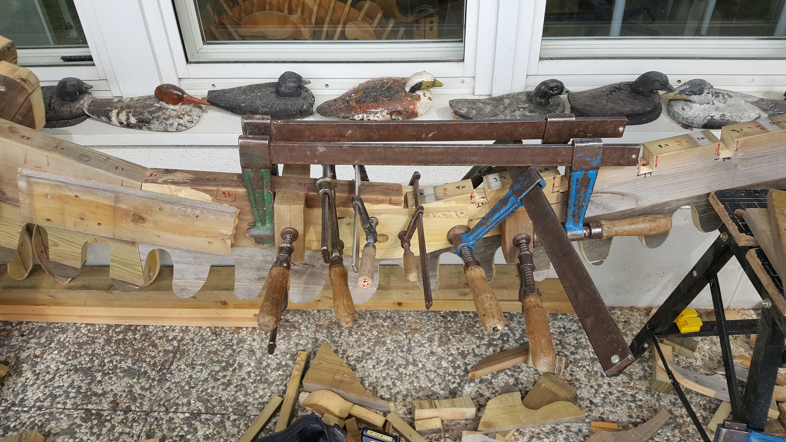 Before we could start test-fitting the ribs, we had to redo the broken neck joint. Here is an image of the clamps we used to keep the pieces in place while the glue dried. Hopefully we used enough... Well, at least we have all our ducks in a row! :)