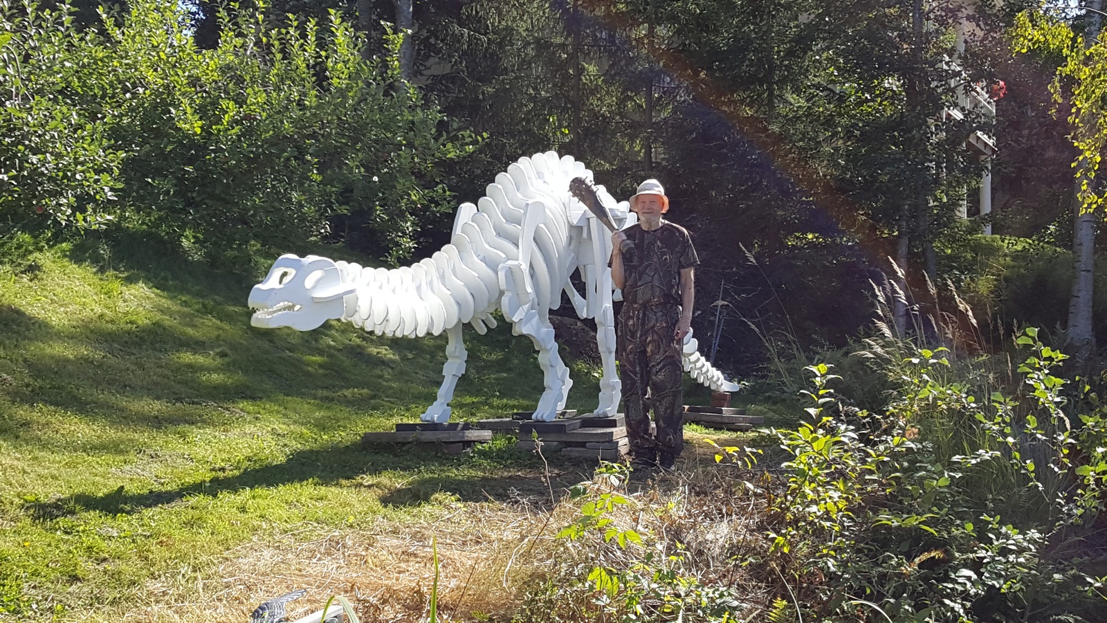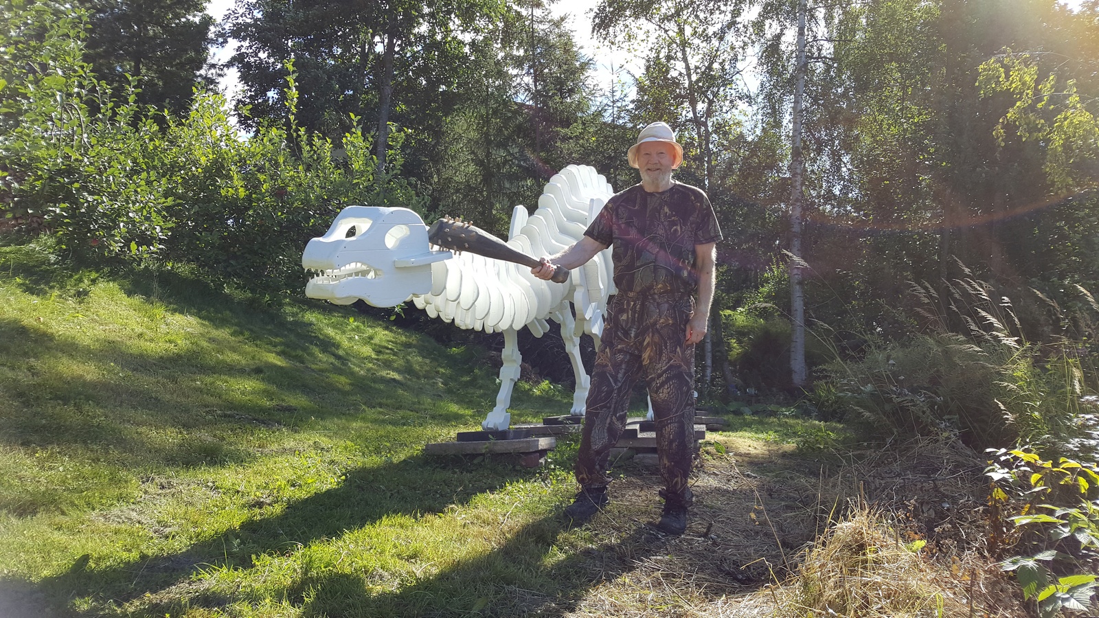 Finally, here are a couple of images with my dad posing in front ouf our lawn dinosaur. The great hunter with his prey!